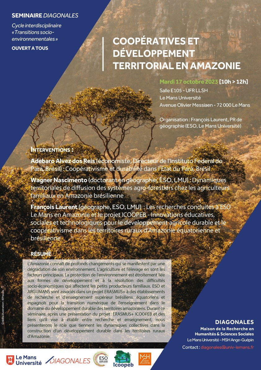 - François LAURENT (géographe, ESO, Le Mans Université) : « Les recherches conduites à ESO Le Mans en Amazonie et le projet ICOOPEB - Innovations éducatives, sociales et technologiques pour le développement agricole durable et le coopérativisme dans les territoires ruraux d'Amazonie équatorienne et brésilienne »
